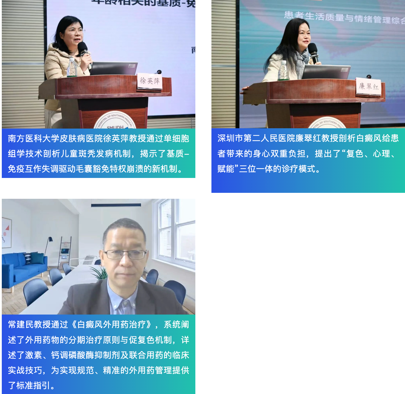 在主旨演讲环节,全国皮肤病诊疗领域的多位权威专家齐聚一堂,聚焦白癜风的临床难点、诊疗进展与实践路径,结合各自丰富的临床案例与前沿研究成果,向现场同仁倾囊相授诊疗经验。